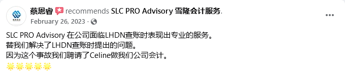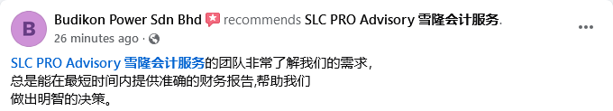 欢迎来到我们的会计事务所!SLC PRO Advisory 事務所位於雪蘭莪,是一家提供全方位會計、稅務和財務諮詢服務的專業機構。创始人Celine Chai 自2007年以来从事会计和税务工作,拥有超过17年的经验。我们是一支充满激情和专业精神的团队,致力于为客户提供高质量的会计、审计和税务服务。我们的目标是帮助企业在复杂的财务环境中取得成功。